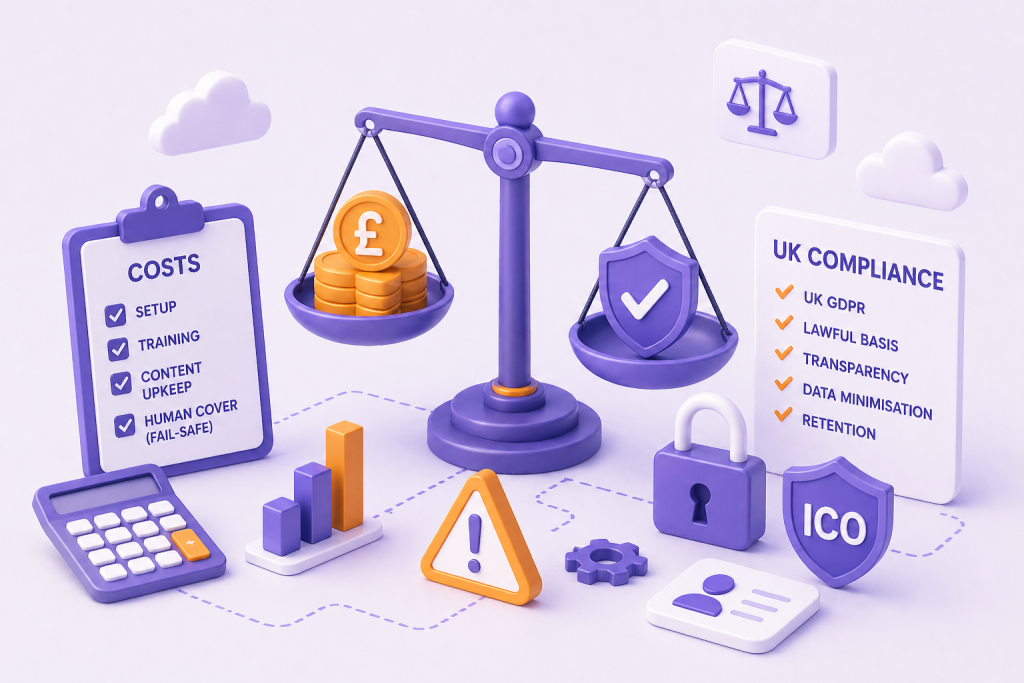 People obsess over the monthly licence and ignore the real costs: setup, training, content upkeep, and human cover when automation fails. If you want a realistic baseline, we broke down typical figures in our AI chatbot cost guide for UK small businesses.